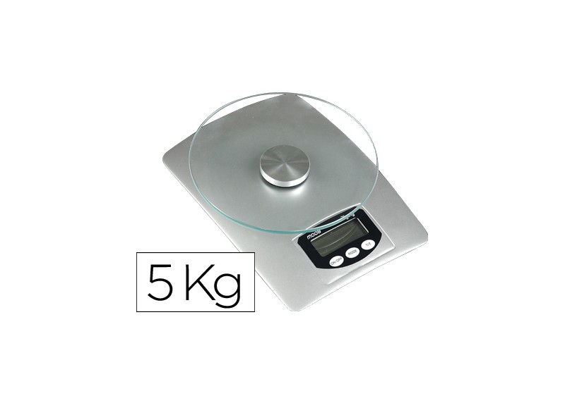 Plataforma de cristal templado de 4 mm. Con capacidad hasta 5 kg. Graduación cada 2 g. Pantalla lcd.